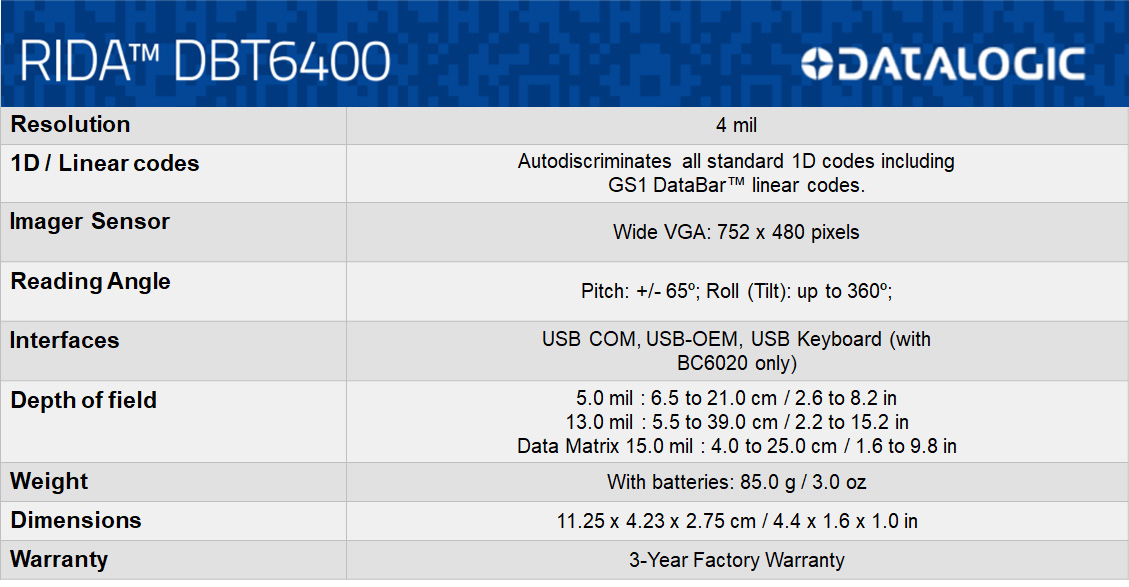 Datalogic Rida™ DBT6400 Specification