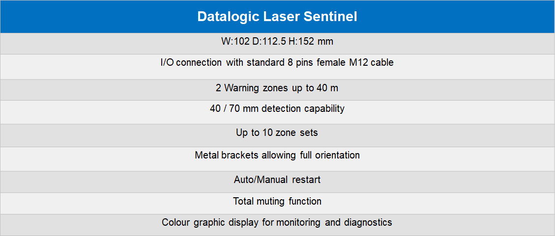 Datalogic Laser SentinelSafety Laser Scannersrobot cells or safe monitoring of access to dangerous machines. sides of a machine or of a vehicle, with the possibility of programming, monitoring and dynamically changing the shape and position of safety and warning areas from a single point. of the safe communication established between them with an Ethernet cable which also carries the power. |