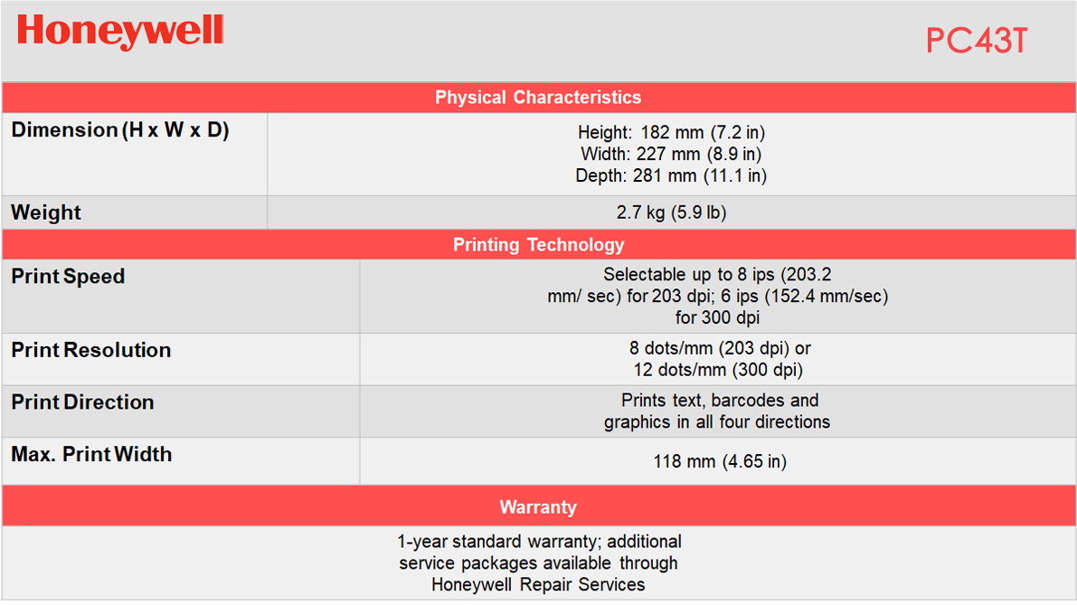 Honeywell PC43T Specification![]() Honeywell PC43T Features