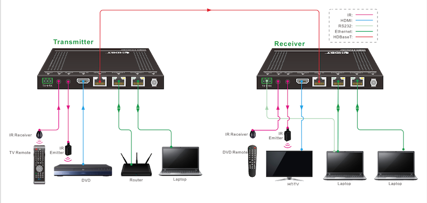 receiver set designed to extend natural and uncompressed ultra HD 4K signals from your HDMI source device to a 4K display remotely located 230 feet away and full HD 1080p signals up to 330ft.(100m). either the sender or receiver. For dynamic range and wide color range (gamut) HDR and 4:4:4 Chroma color sampling are one of the key features of these extenders. |