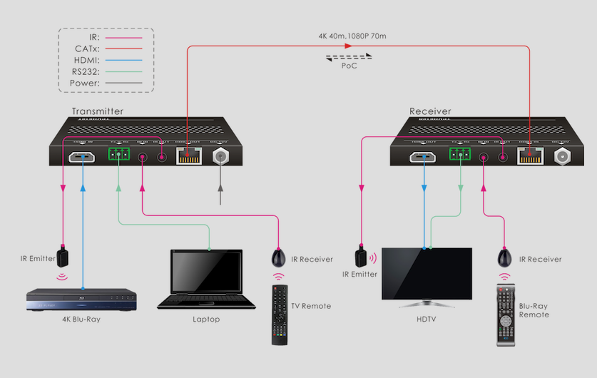 receiver set designed to extend natural and uncompressed ultra HD 4K signals from your HDMI source device to a 4K display remotely located 230 feet away. side, either the sender or receiver. For dynamic range and wide color range (gamut) HDR. |