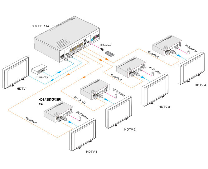 Note: The Splitter does not include HDBaseT Receivers: HDBASE70POER receivers are ordered separately, please contact sales for more information. Applications: Perfect for multi-screen classrooms or presentation rooms, retail showrooms, sports bars, and digital signage where you can route and distribute high resolution signals to several displays 230 feet from a remote based media player or PC.